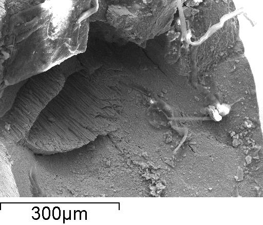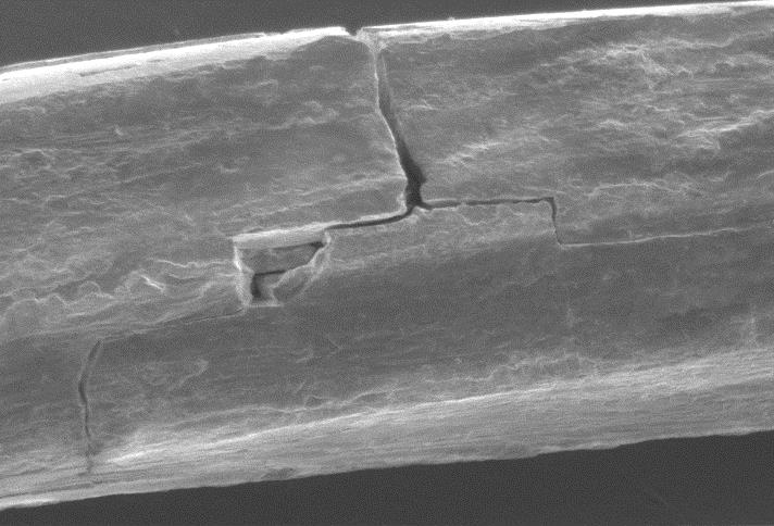 In direktem Zusammenhang mit der vorgestellten Versuchsreihe wurden am Institut für Werkstoffwissenschaft der TU Dresden Analysen ausgewählter Drahtproben durchgeführt. Ziel dabei war es den Einfluss von Verdichtungsprozessen auf das Ermüdungsverhalten von Drähten in laufenden Drahtseilen zu ergründen. Ein spröderes Ermüdungsverhalten von verdichteten oder gehämmerten Drähten konnte bei Dauerbiegeversuchen sowie in Schadensbegutachtungen oft vermutet werden. Dabei sind neben der kleineren Seillebensdauer vielmals typische stufenförmige Ermüdungsdrahtbrüche festzustellen (Abbildung 8), welche bei unverdichteten Seilen eher selten zu finden sind. Um diesen Effekt zu erklären wurden u. a. Schliffbilder und REM-Analysen durchgeführt.